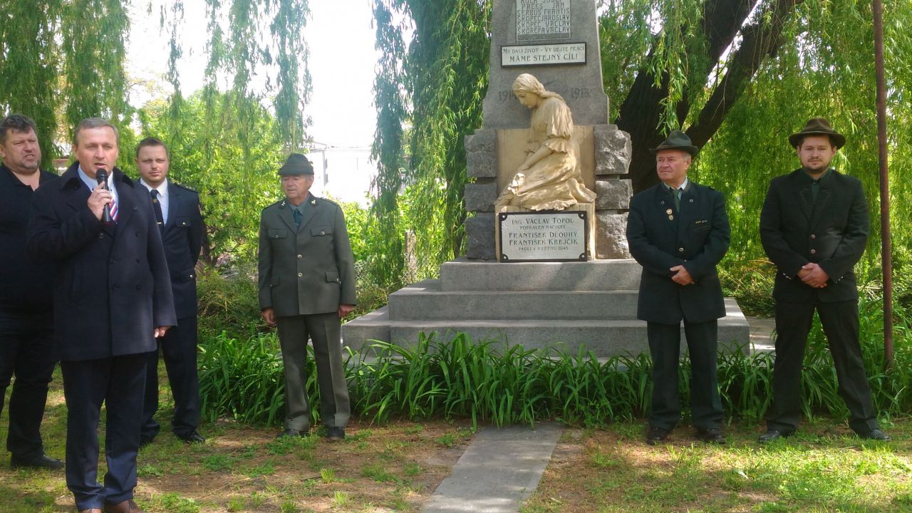Po vyslechnutí české státní hymny přednesl projev starosta obce. Poté spolu s bývalým starostou položil kytici k pomníku a poklonil se obětem války.